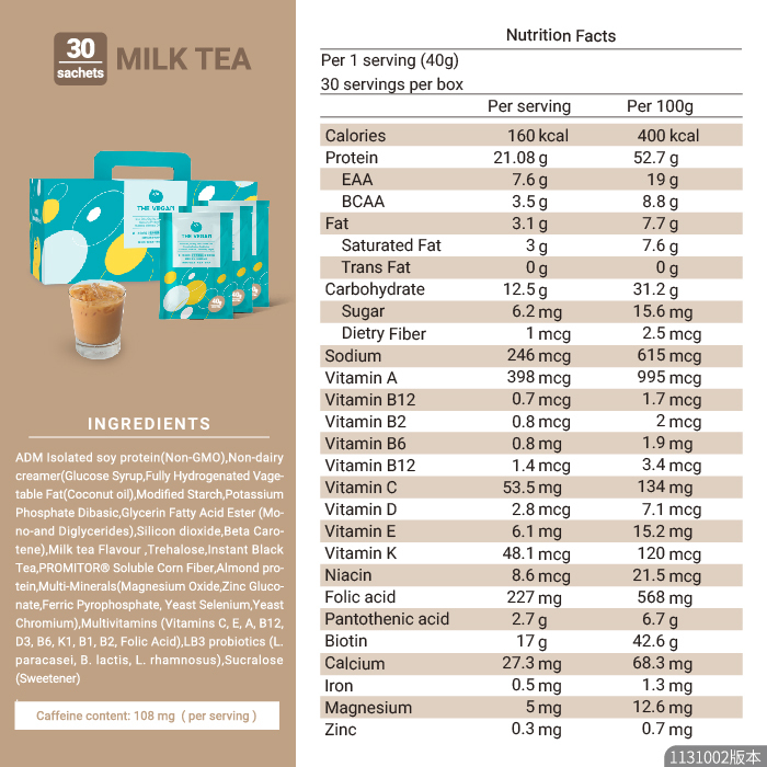 Tastes just like your favorite milk tea—sweet, comforting and never too much. With this cup, you get to enjoy both deliciousness and nutrition in one go. ⚠️ THE VEGAN’s “Milk Tea / Milk / Latte” flavors refer to taste profiles only. All products are 100% plant-based & contain no dairy ingredients