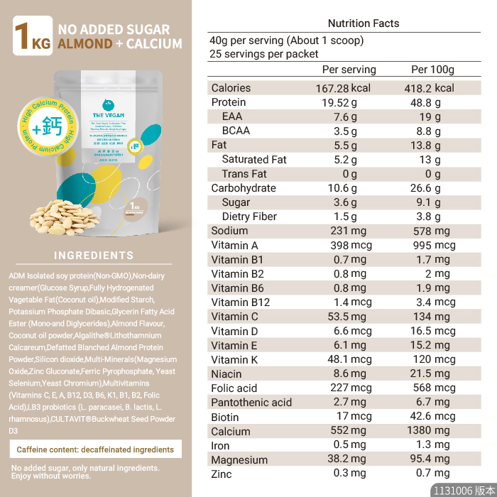 【THE VEGAN】High Calcium Plant-Based Protein – No Extra Added Sweetness Almond (1kg)